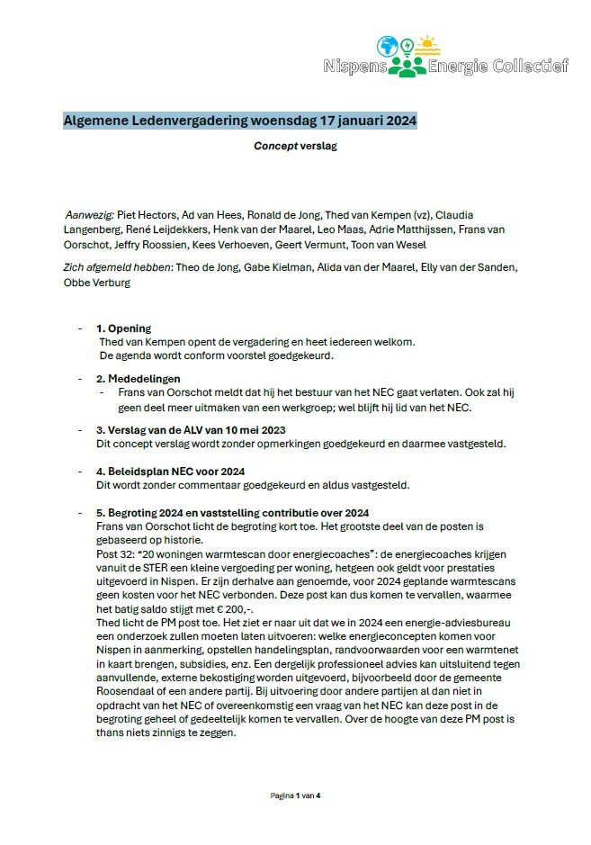 Maandag 13 mei 2024, tijdens de Algemene Ledenvergadering (ALV), hebben de leden het verslag van de ALV van 17 januari 2024 goedgekeurd. Zie hieronder het definitieve verslag.